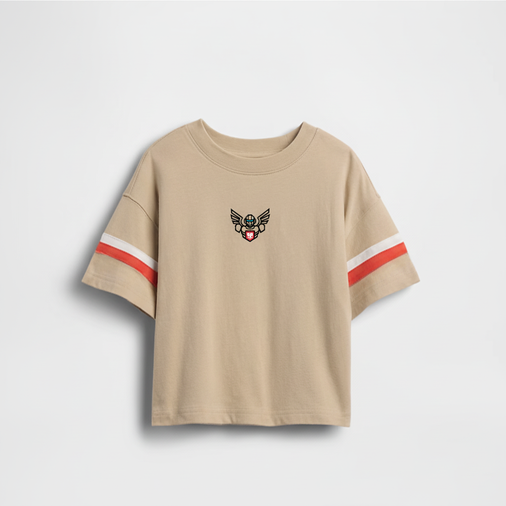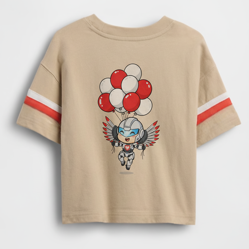 Koszulka łączy lekko boxy krój z unikalnymi detalami: na rękawach naszyte taśmy w barwach Polski tworzą efekt premium i sportowej energii.
