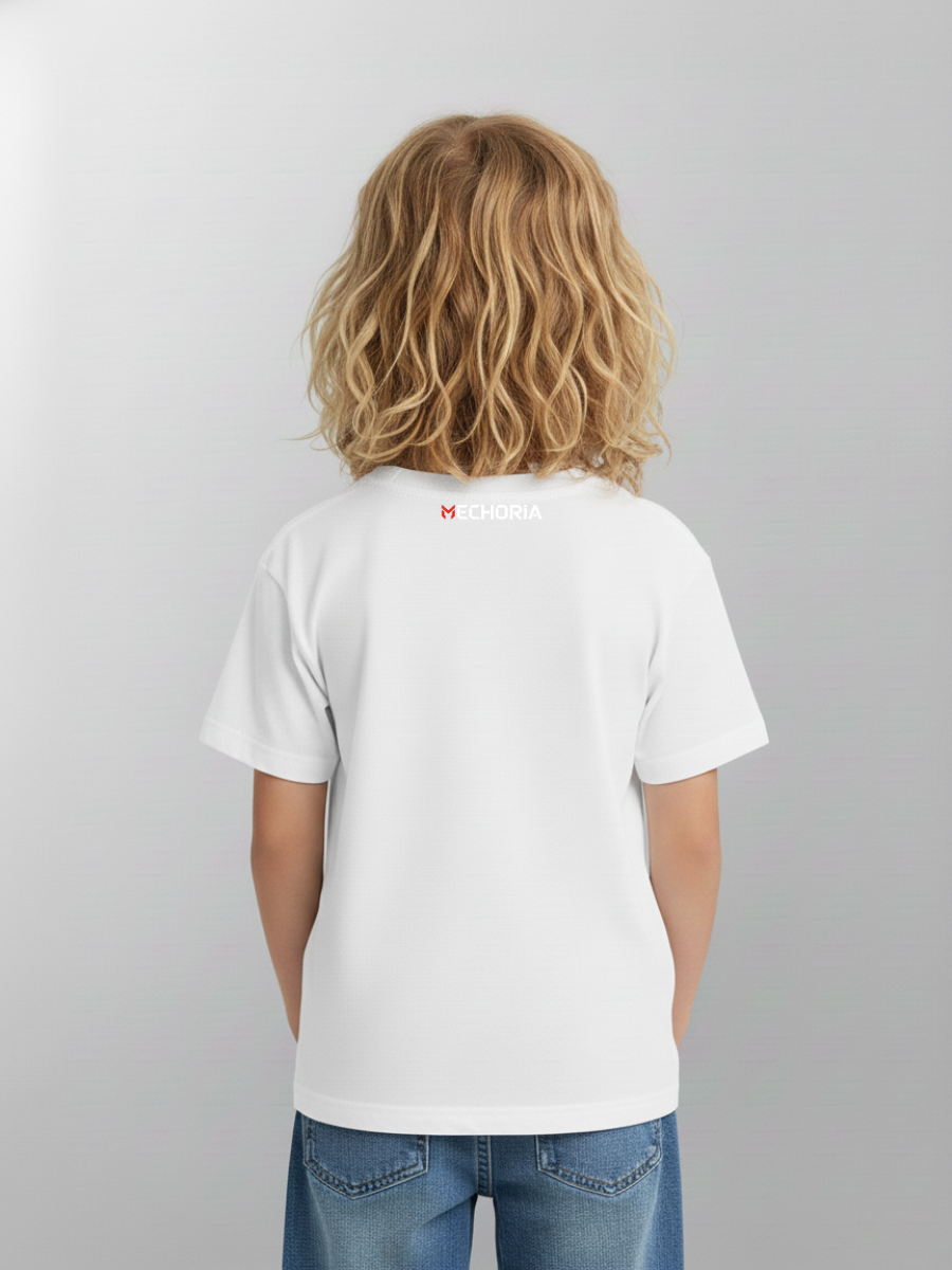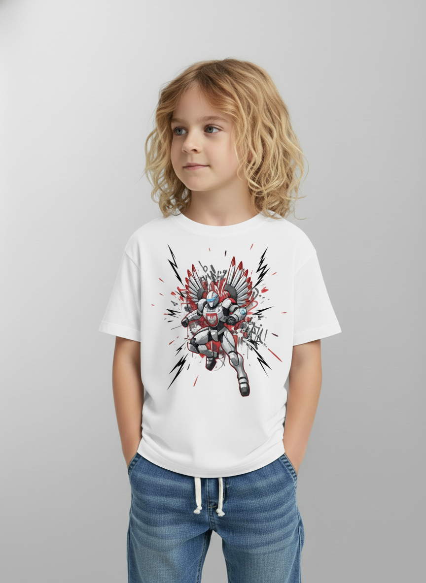 Grafika przedstawia polskiego mecha w dynamicznym ruchu – otoczonego błyskawicami, jakby właśnie przebijał dźwiękową barierę. Symbol nowoczesnego patriotyzmu i młodej, niepowstrzymanej energii Mechoria.