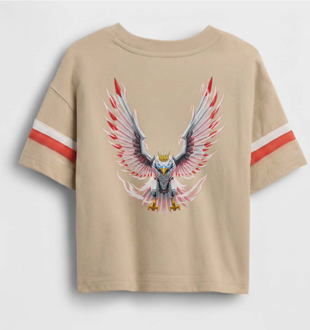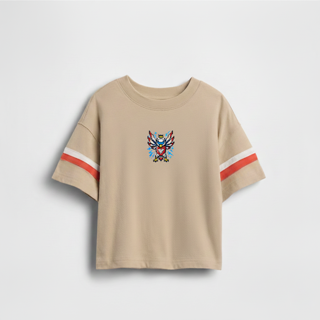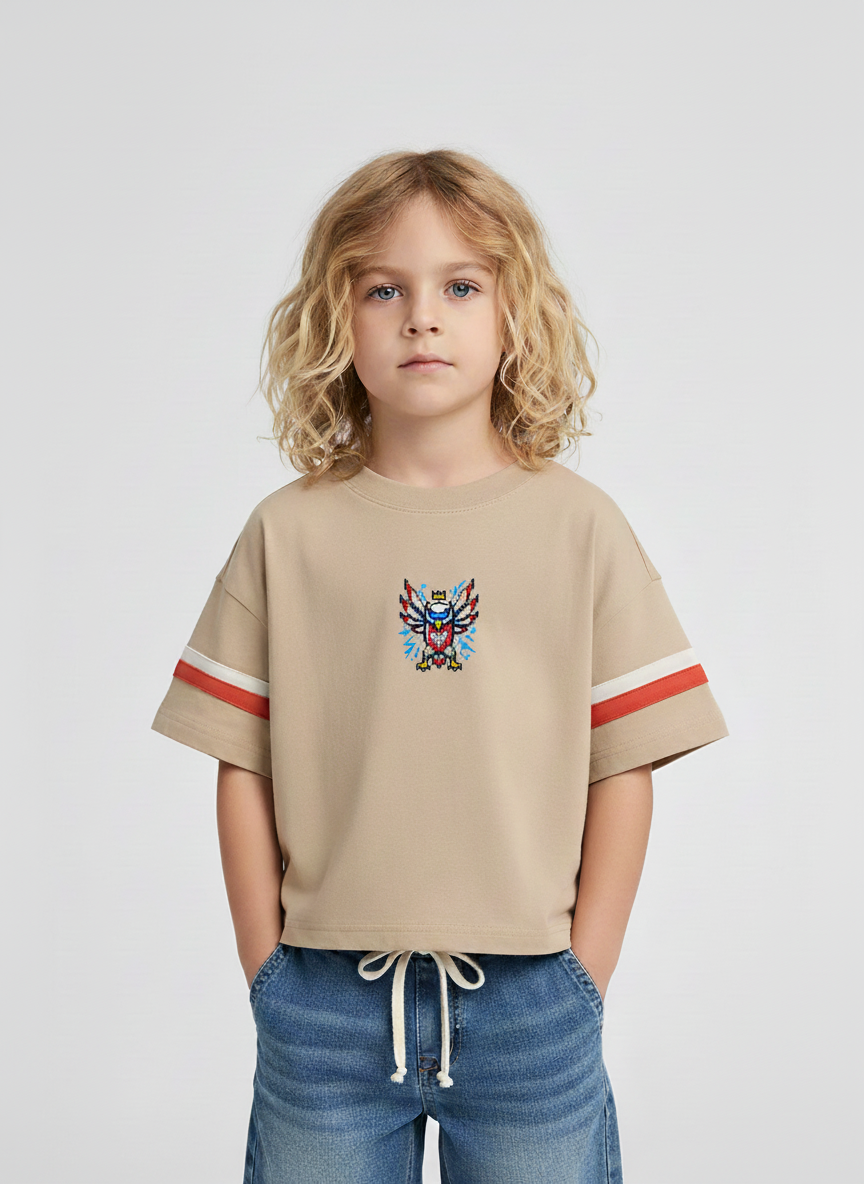 Koszulka łączy lekko boxy krój z unikalnymi detalami: na rękawach naszyte taśmy w barwach Polski tworzą efekt premium i sportowej energii.